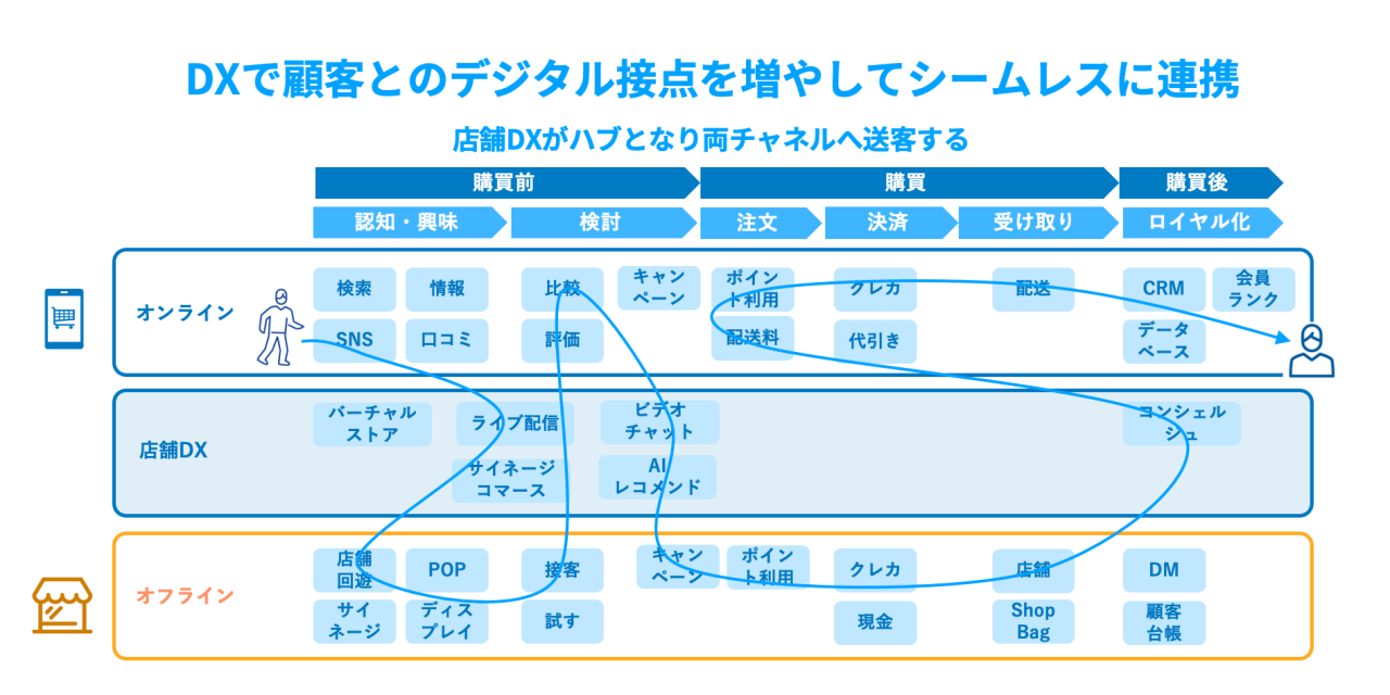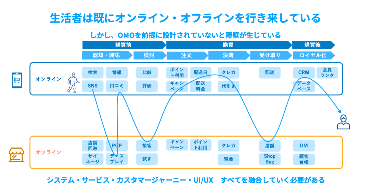 SNSや口コミをきっかけに商品を知り、ECサイトなどで情報収集した上で、実店舗に足を運んで商品を実際に見て、購入にはECサイトを利用するといったように、顧客は無意識にオンラインとオフラインが融合したジャーニーを経て最終的な商品購入に辿り着いています。