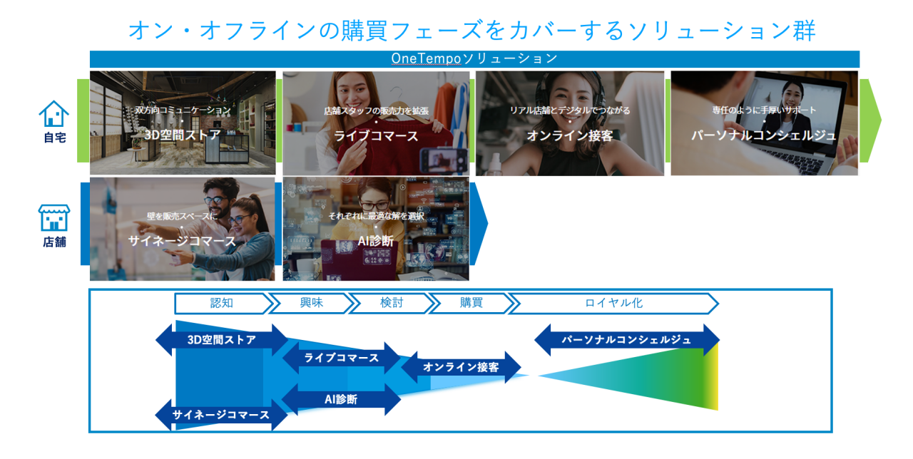 One Tempo では、自宅と実店舗どちらのサービスにも利用できるソリューションをそろえています。このソリューション群は、認知からロイヤル化のステップまで、すべての購買フェーズを網羅している内容となっています。