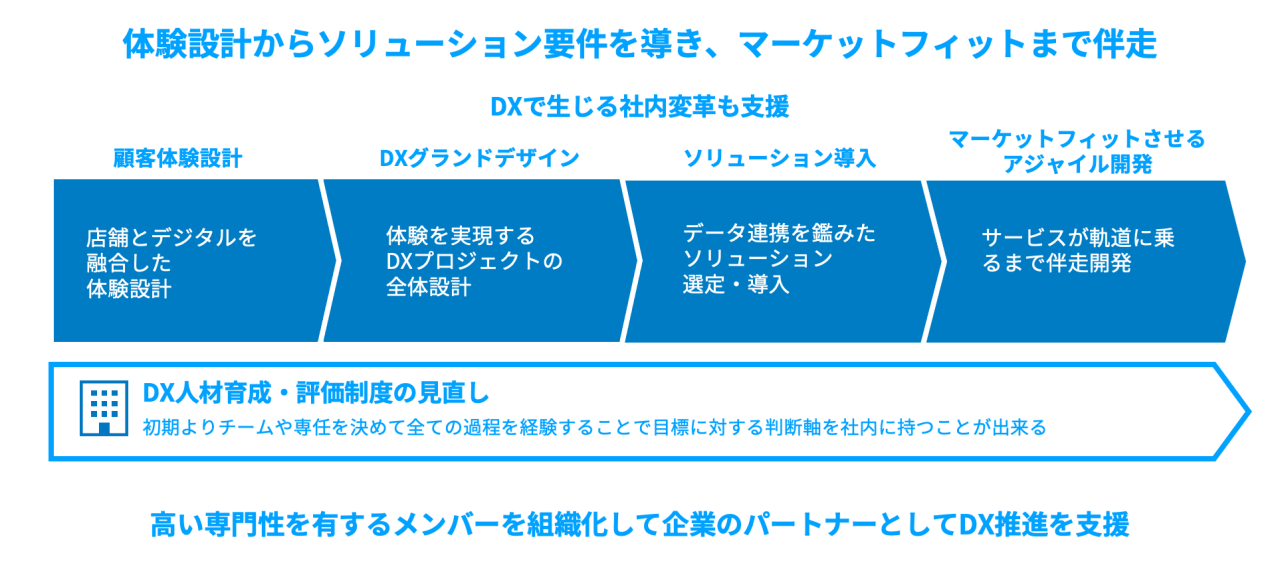 電通デジタルは単なるソリューション提供にとどまらず、顧客体験設計やDXプランニングも併せてサポートできます。またソリューション導入後も市場にフィットするまでアジャイル開発をして伴走支援を続けます。さらに、今後企業の課題となるDX人材の育成や、従業員の評価制度の見直しなども、専門性の高いメンバーがパートナーとして支援していきます。