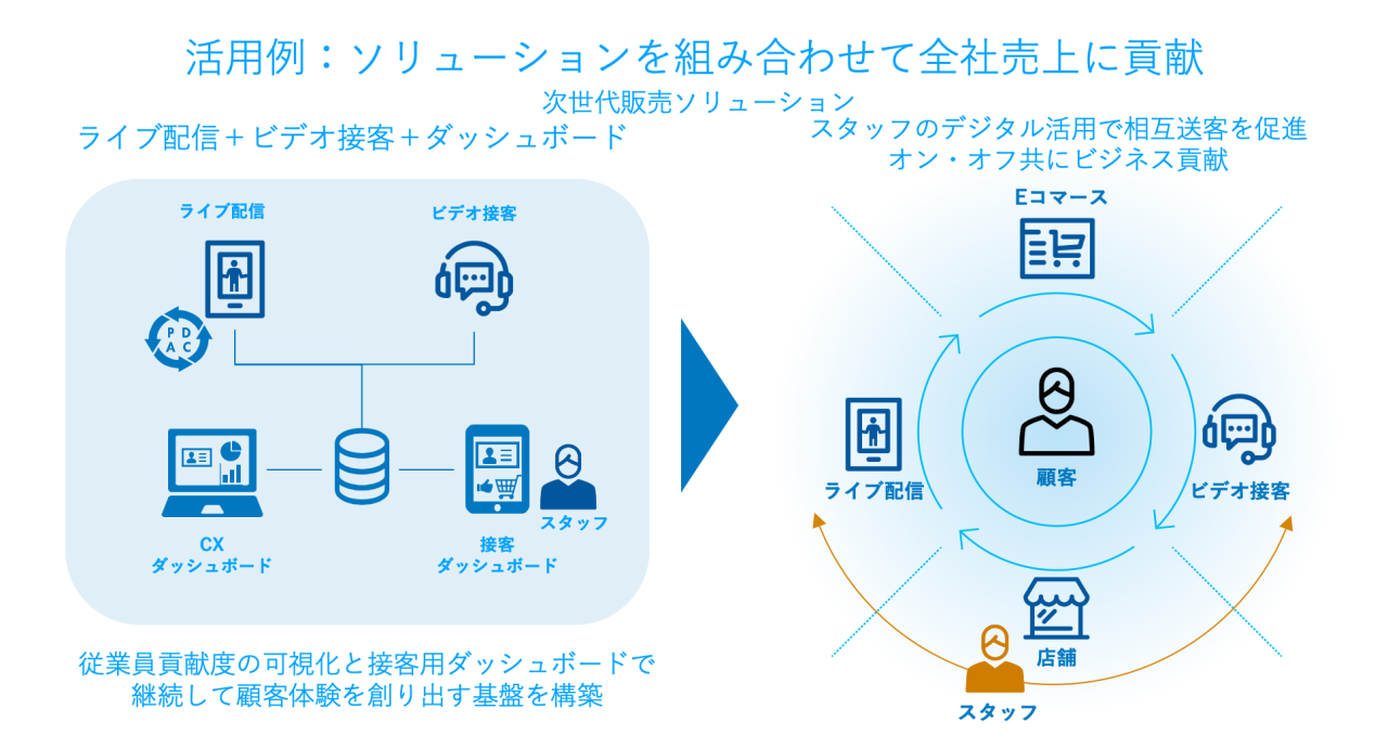 さらにライブ配信とビデオ接客、ダッシュボードを組み合わせた次世代の販売ソリューションも提供。ツールを通じてオンライン、オフラインに相互に送客することで、ECだけでなく実店舗の売り上げも増加させることも可能です。