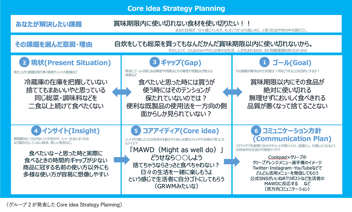 そうした経験を踏まえて発表内容を聞いていたが、まずこのテーマについて深くリサーチしていると感じた。コミュニケーション方針としてソーシャルメディアを活用するといった踏み込んだプランまで考えられていることも素晴らしい。コアアイディアである『食べ物を適切に保存し、使い切ることを自分ゴト化してもらう』という考え方もシンプルだ。