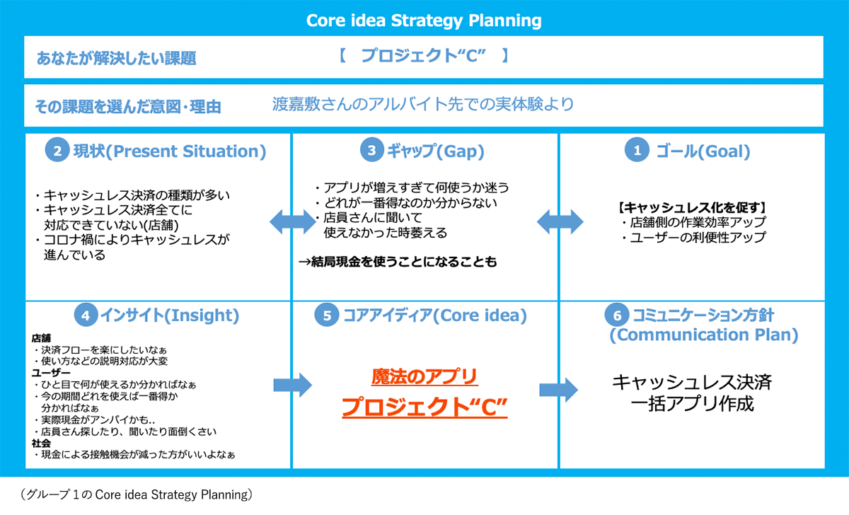 ● 新型コロナウイルスの影響で起こった社会課題や身の回りの小さな課題などを解決したいと思った。今回使った「Core idea Strategy Planning」のフレームワークに当てはめると現状を把握したり、整理しやすくなると感じた。