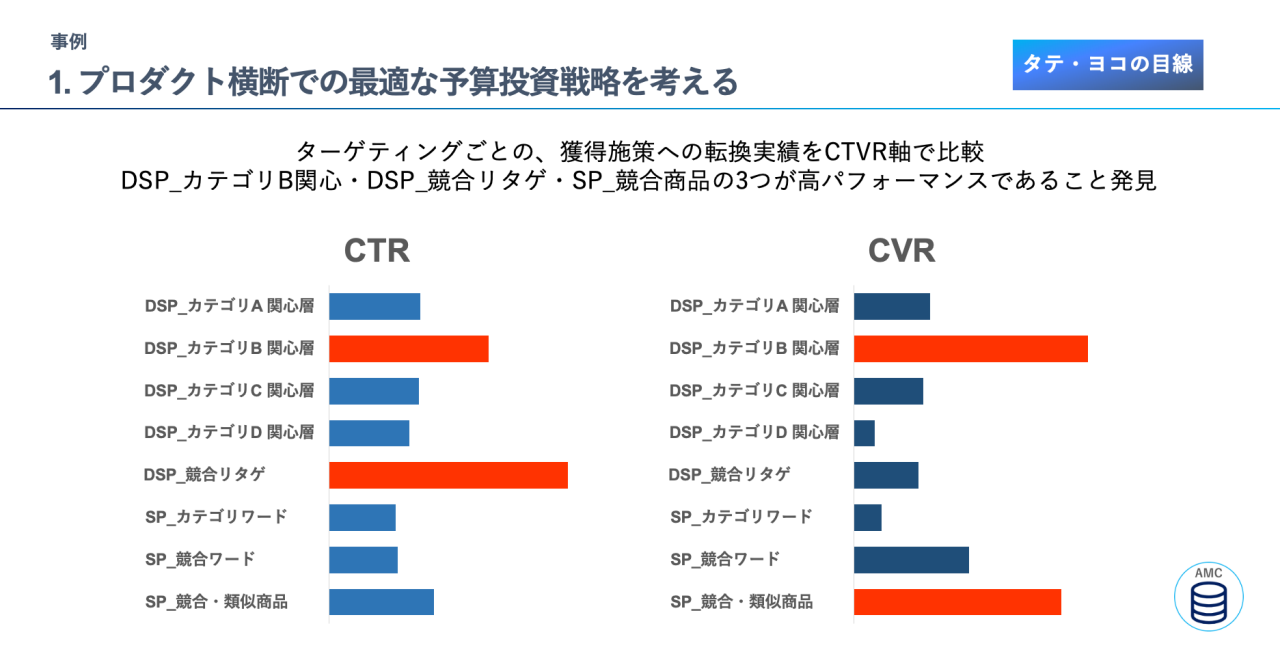 AMCでの分析②ステップアップ効率:さらに、ターゲティングごとにステップアップの効率を、CTR軸、CVR軸で評価。カテゴリB関心層や競合リタゲといった相対的に高いパフォーマンスをあげているターゲティングの予算を増額。逆に、パフォーマンスが低かったターゲティングを抑制し、全体の獲得効率の最適化を行いました。