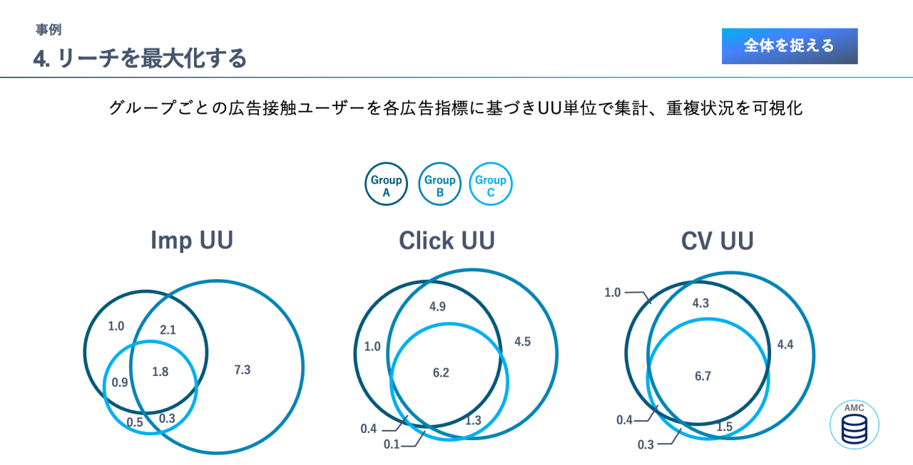 AMCでの分析①各グループの重複状況の可視化:各グループの広告接触ユーザーを各広告指標に基づいてUU単位で集計し、重複状況を可視化したところ、下図のような結果となりました。