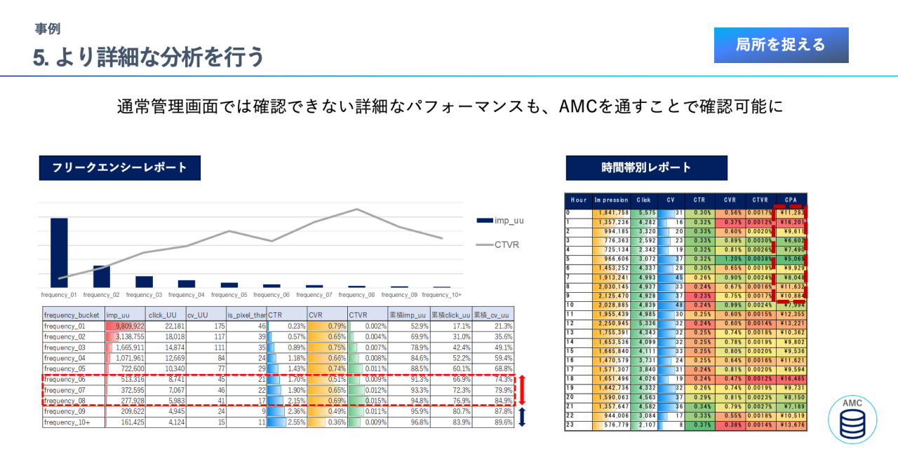 AMCであれば、フリークエンシーレポートや時間帯別の配信パフォーマンス分析など、通常の管理画面ではレポーティングできない詳細なデータに関しても抽出できるようになると解説。「ポイントを絞って局所的な傾向を見出すことで、日々の配信パフォーマンスをさらに向上させる打ち手につなげられます」と、AMC活用の可能性に言及しました。