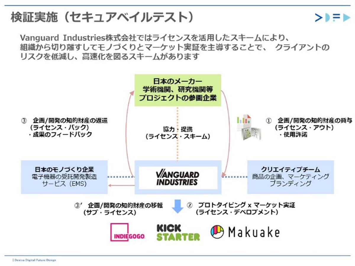 Vanguard Industriesの特徴として、大手企業や大学が所有する研究開発領域のプロダクトを、ライセンスという形で一時的に切り離すスキームがあります。「これによって、企業や研究所が表立って公開できないプロダクトをプロトタイピングし、実証結果と知的財産のライセンスで戻す形で、オープンイノベーションを実践しています。」(山中氏)