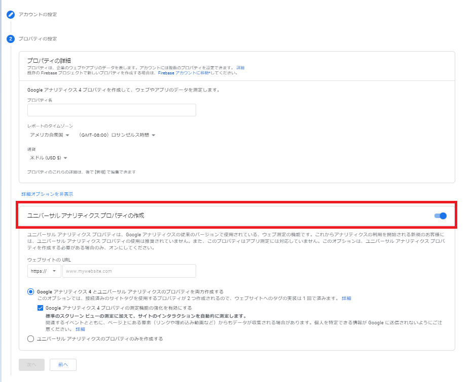 プロパティの設定の際に「ユニバーサルアナリティクスプロパティの作成」をオンにすると、自動的に2つプロパティが作成されます。GA4で設定した内容はUAにも多少反映されますが、GA4の設定後にUAのプロパティ設定をすることをおすすめします。