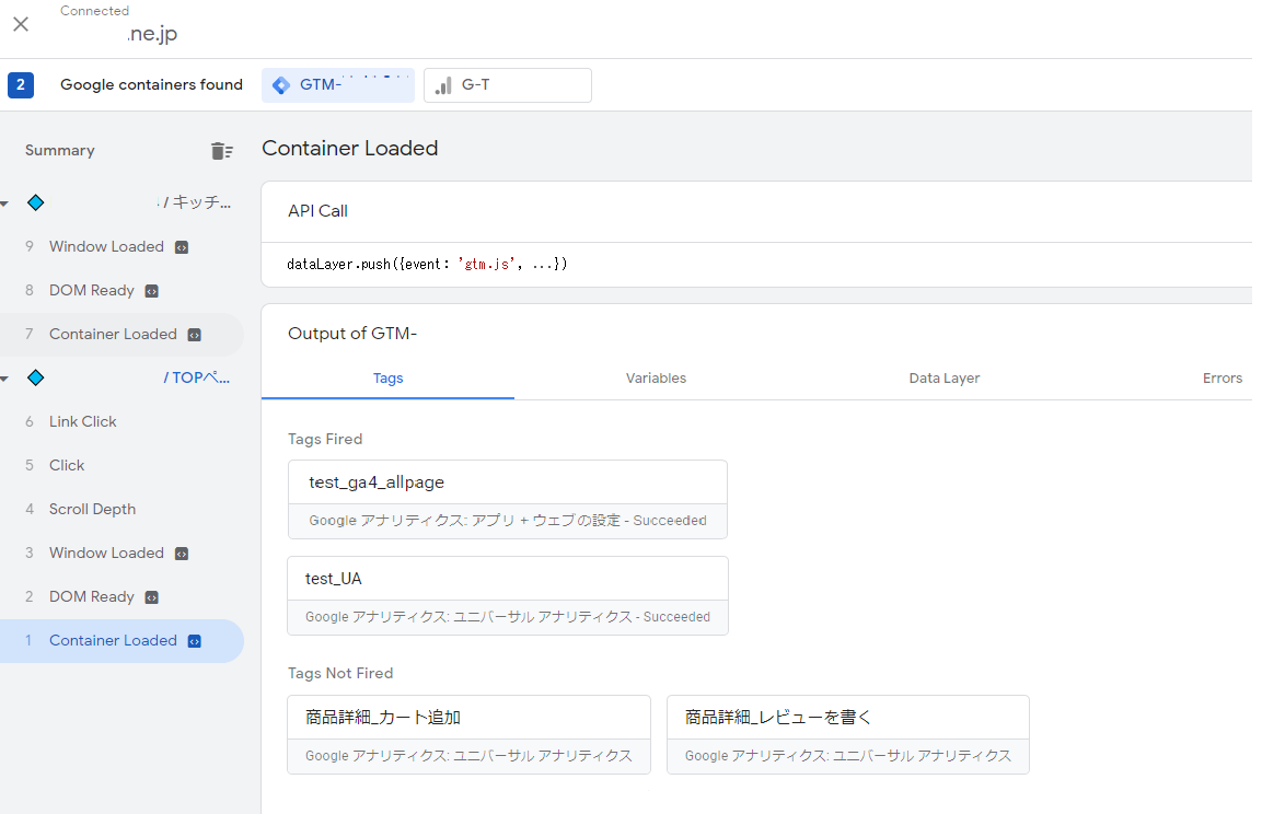 今回作成したのはTest_GA4ですが、「Tags Fired」しています。これでプレビューでの確認は完了です。