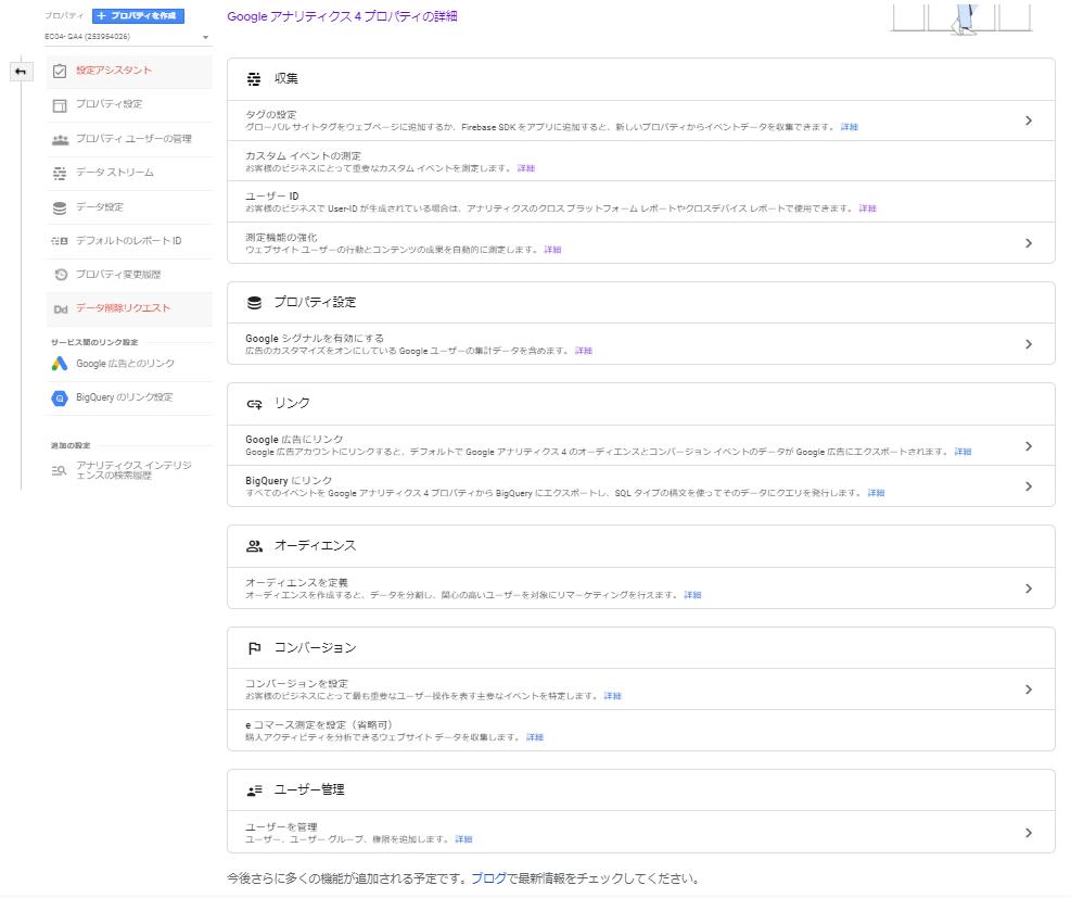 GA4プロパティ設定ですが、管理画面に「設定アシスタント」という項目があるので、それにそって実行すると漏れがありません。
