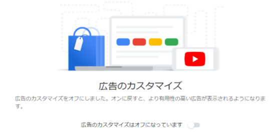 ※Googleアカウント内の広告のカスタマイズ設定画面です。デフォルトは有効になっています。