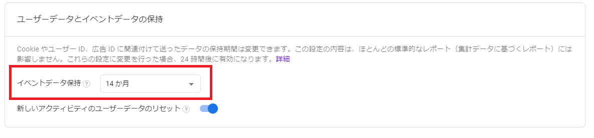 通常のレポートには問題ありませんが(ユーザー単位のデータ(コンバージョンを含む)の保持期間は最大 14 か月に固定されています)、カスタムセグメントやカスタムレポートを使う際のデータ保持期間を2か月または14か月のどちらかを選択する必要があり、14か月を推奨します。