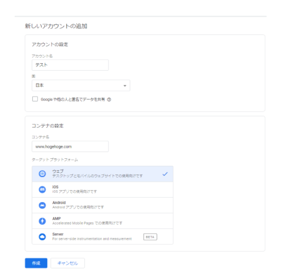 次にアカウントの設定フォームにアカウント名、国(日本)、コンテナ名(後に変更可能)、ターゲットプラットフォームはWeb、を選択して作成をクリックします。