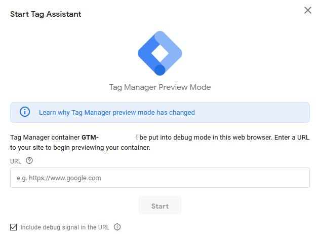 プレビューモードも2020年秋に変更になりました。GTMの右上にあるプレビューボタンをクリックすると、プレビューの操作画面が別タブで立ち上がります。URL欄にGTMのタグを設置した検証したいサイトのURLを入力します。(サイトにベーシック認証を設定していても問題ありません)