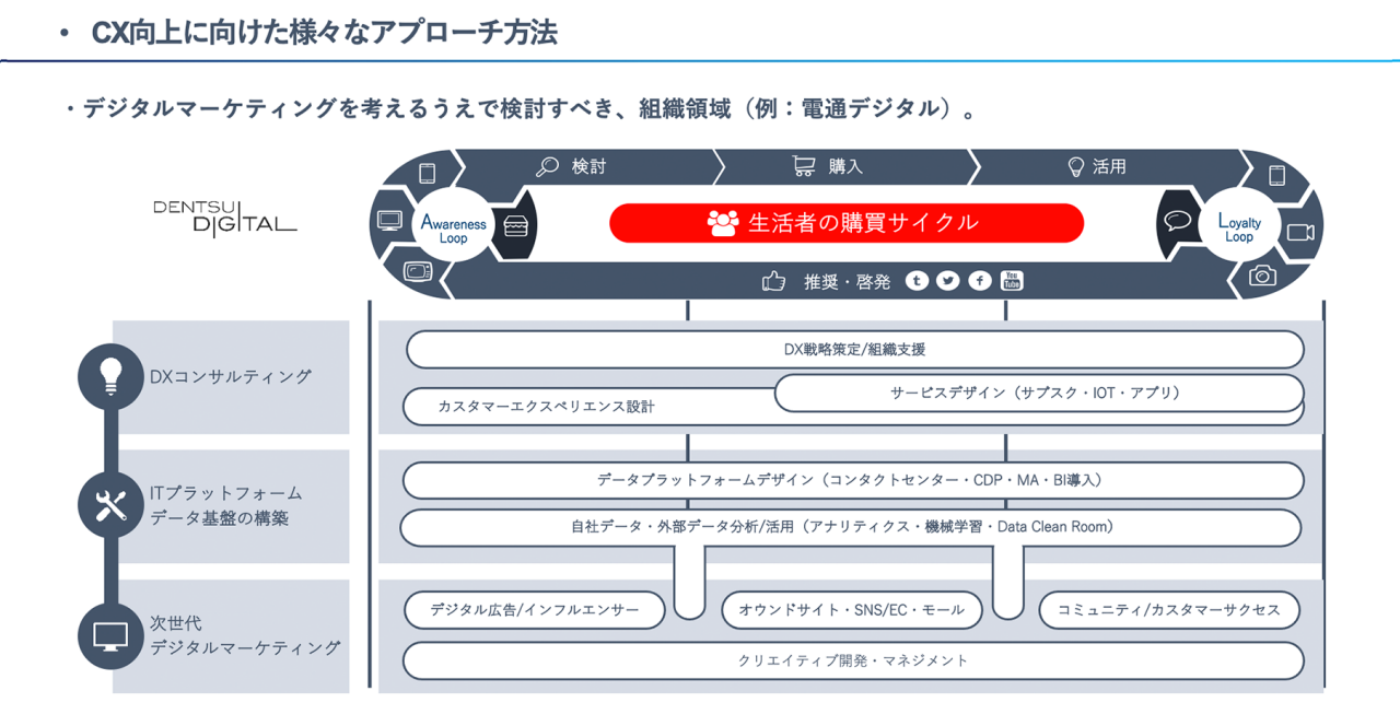まず、デジタルマーケティングを考える上で検討すべき組織領域を、電通デジタルを例に整理してみたいと思います。