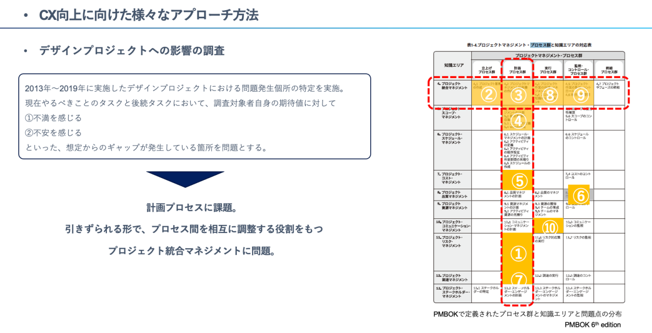 2013年から2019年の中で実施したデザインプロジェクトにおいて問題発生箇所を調査し、PMBOKの第6版で定義されたプロセス群と、知識エリアに問題点をプロットしました。
