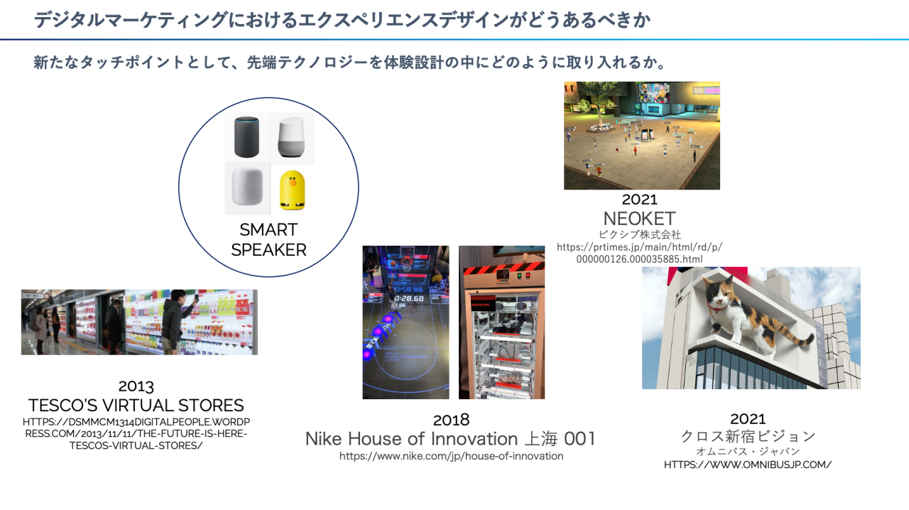 2013年、韓国のとある駅に現れた壁一面のオンラインストアや日常生活でスマートスピーカーが活用されるようになったり、2018年の上海NIKEでは体験を中心とした店舗設計が行われたりと、このところ実施してみたくなるような魅力的なテクノロジーが実際に活用されている例はたくさんあります。