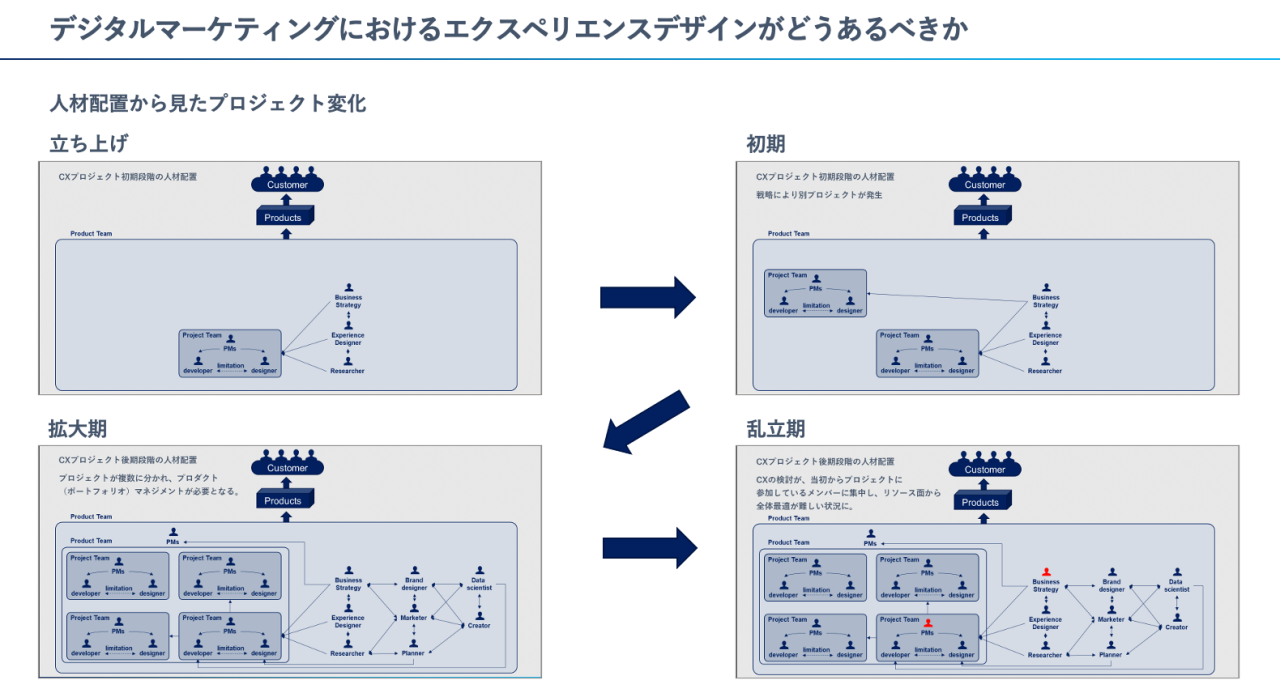 さらに段階が進み、プロジェクトマネージャーはスコープクリープを避けるため、プロジェクトを分割します。様々なプロジェクトが乱立していくので、プロジェクトチームとしてプロダクトマネジメントを開始します。このような状況の中、CXの検討というのは、当初からプロジェクトに参加しているメンバーに集中し、リソース面からも、全体最適やコントロールが難しい状況となっていきます。