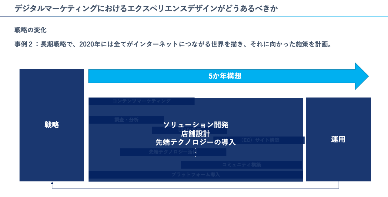 もうひとつ、ケースを見てみましょう。長期戦略(5か年構想)で、「2020年には全てがインターネットに繋がる」という世界を描き、それに向かった施策を計画・実行することになったとします。