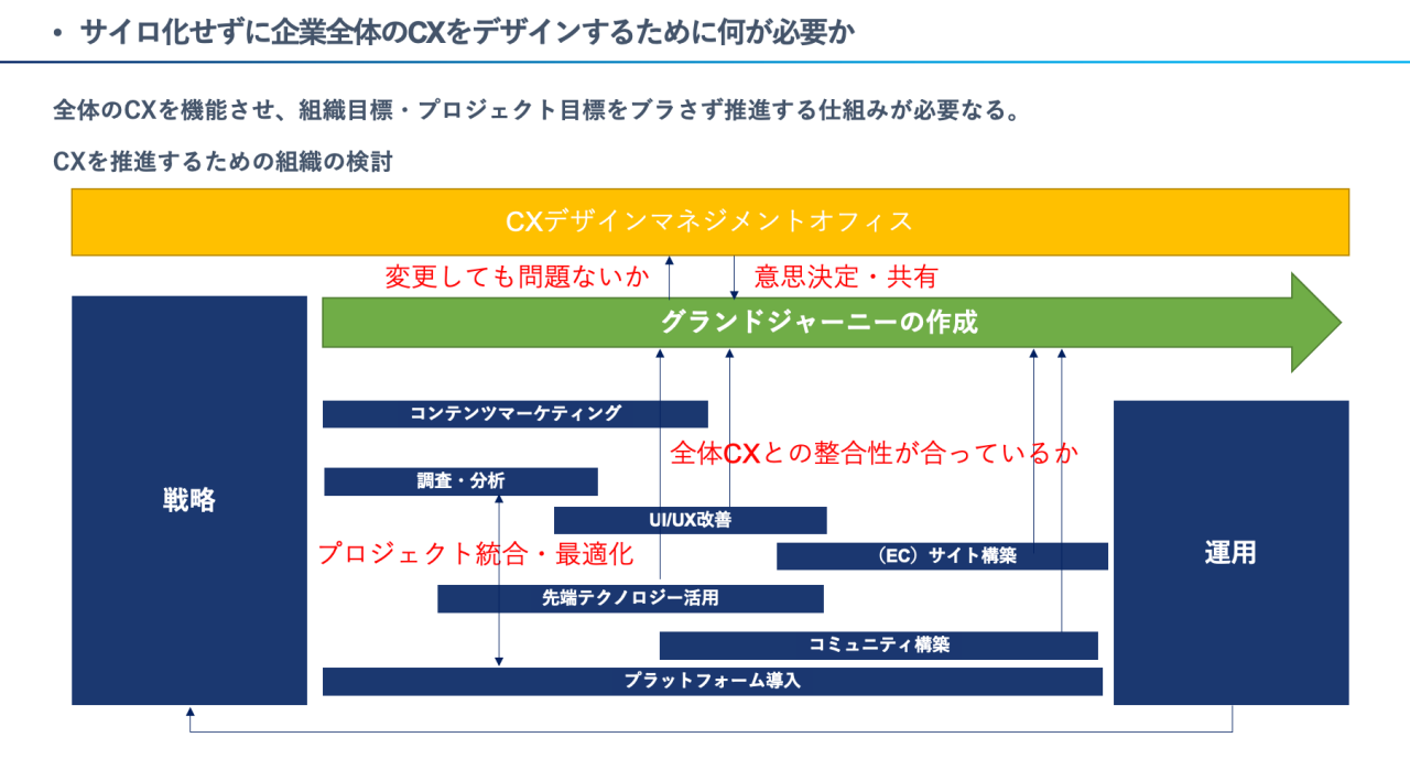 グランドジャーニーの変更をしても良いか、それに対する意思決定、新しいCXの考え方の共有、必要があればプロジェクトを統合、最適化する判断を行なうのが、このCXデザインマネジメントオフィスです。