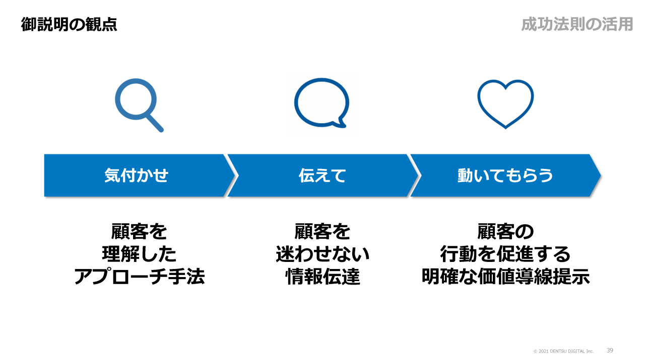 CV貢献の高いUI/UXの成功法則のうち、「気づかせ」「伝えて」「動いてもらう」という顧客態度変容の流れに焦点を絞ってご紹介します。