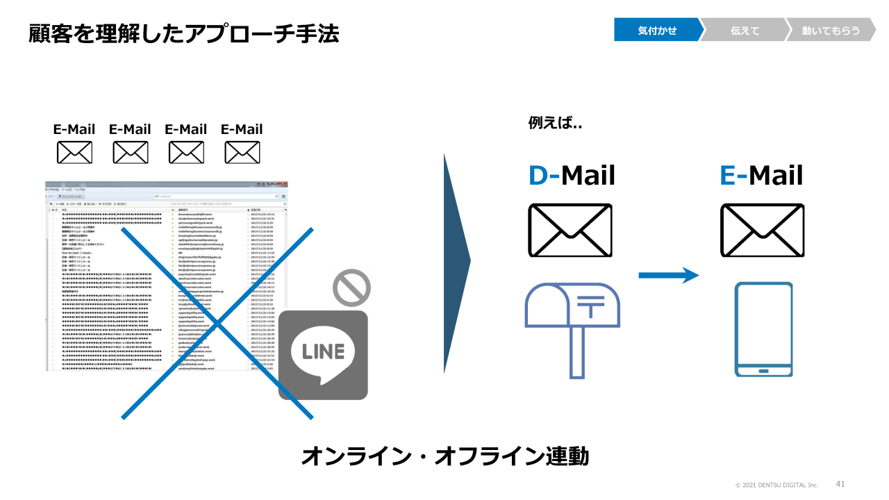 顧客の心に届けるには、顧客を理解したアプローチ手法をとらなくてはいけません。たとえば、オフラインでDMを1通送り、「後日このようなEメールが届くので、詳しくはWebサイトを見てください」と伝えるだけで、劇的に開封率、行動率は向上します。