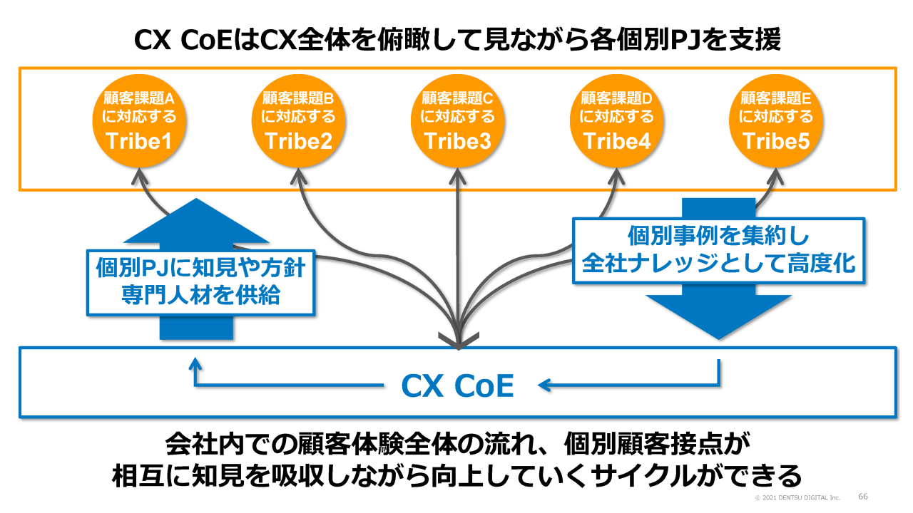 これにより、会社内での全体のCXと、個別プロジェクトでのCXが、相互に知見を吸収しながら向上するサイクルがぐるぐる回って成長することになります。逆にこれがないと、各トライブの知見が、トライブの中に閉じたままになってしまいます。