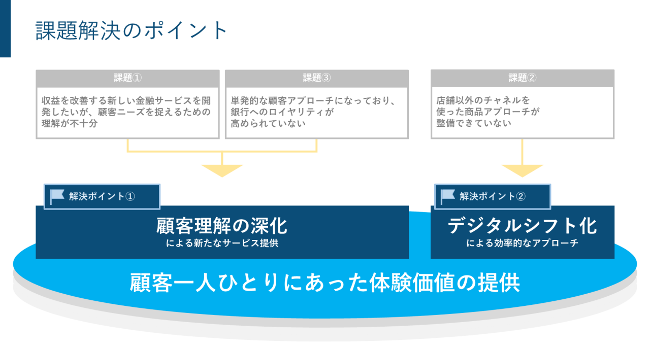 インターネットを主戦場とした新規参入銀行との顧客の奪い合いが激化する中で、従来の銀行側の課題は顧客へのアプローチが単発的であることです。個々の商品が魅力的でも、プロダクトアウト(売りたい商品を売る)的な訴求が中心で、顧客起点でのアプローチができているとは言えません。顧客を理解し、顧客目線で継続したアプローチを行うことが、銀行へのロイヤリティを高め、顧客の囲い込みにつながります。