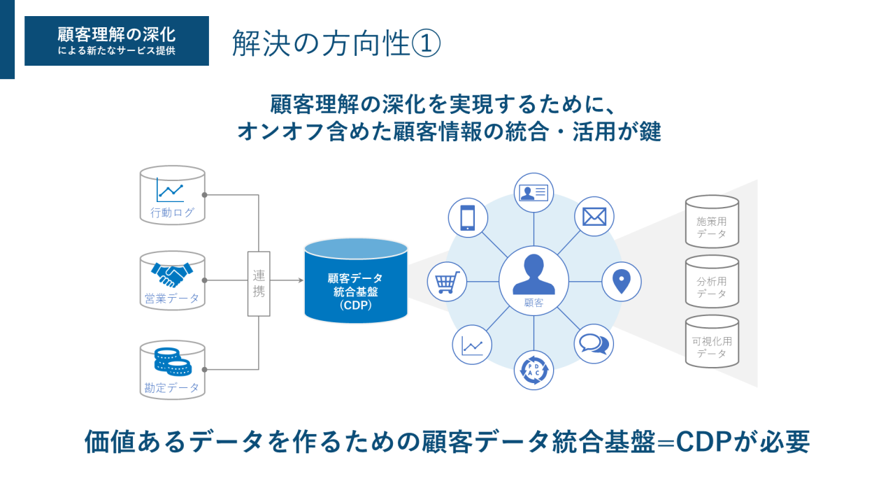 これらの課題を解決するためには、大きく2つの方策が有効です。1つ目は「顧客理解の深化」。顧客を深く理解し、顧客ニーズを的確に捉えたサービスの創出と提供を行うことです。