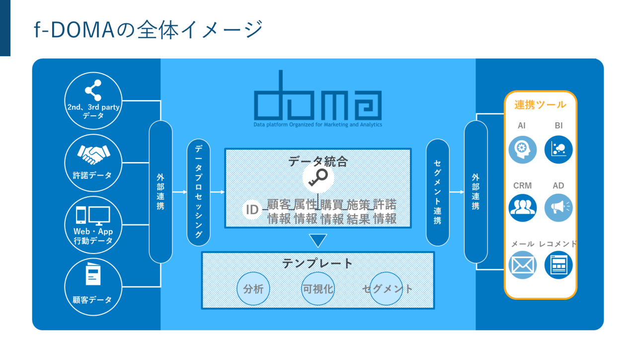 「f-DOMA」は、さまざまなデータソースからCDPへ、CDPから主要なMAツールなどの外部連携ツールへ、スムーズなデータの連携・移行を行います。