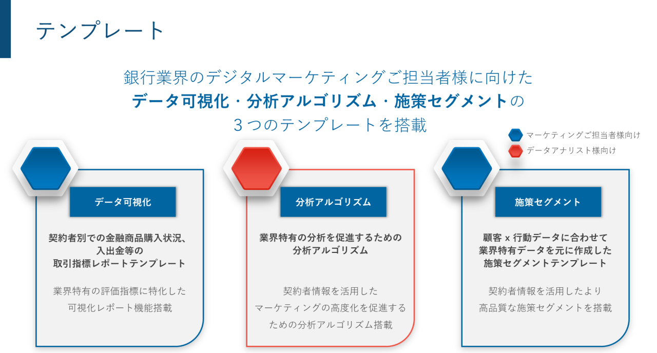 「f-DOMA」には、次の3つのテンプレートが用意されており、マーケティングや分析の効率化・高度化に貢献します。