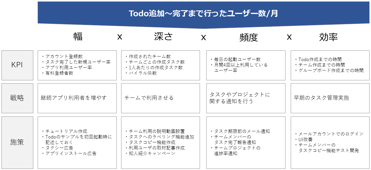 ちなみに、[効率]の部分で「Todo設定から完了までの時間」というKPIを置いたとする。前回の記事で触れた「②上昇をコントロールできる指標に限る」というポイントはまさにこの部分で、Todoを設定してから完了するまでの時間は事業者側がコントロールできるものではなく、タスクの大きさや利用者のコンディションによる。従って、このKPIは機能しないことがわかる。