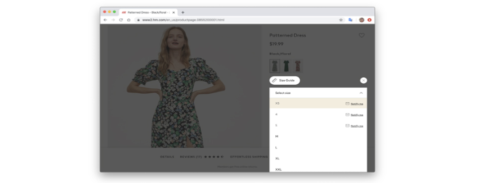 保守的なアプローチをご紹介すると、ブランドは「在庫残り2品」、または「在庫なし」といった情報を通知する機能を商品購入のフローに組み込んでいます。この最たる例が、購入不可の場合に顧客をすぐに別の選択肢へと誘導することで、たとえ欲しい商品が買えなかったとしてもすぐに代替案を提案することができるというものです。例えば、希望する商品の在庫がなかった場合、色違いやサイズ違いで検討してもらうことが可能となります。