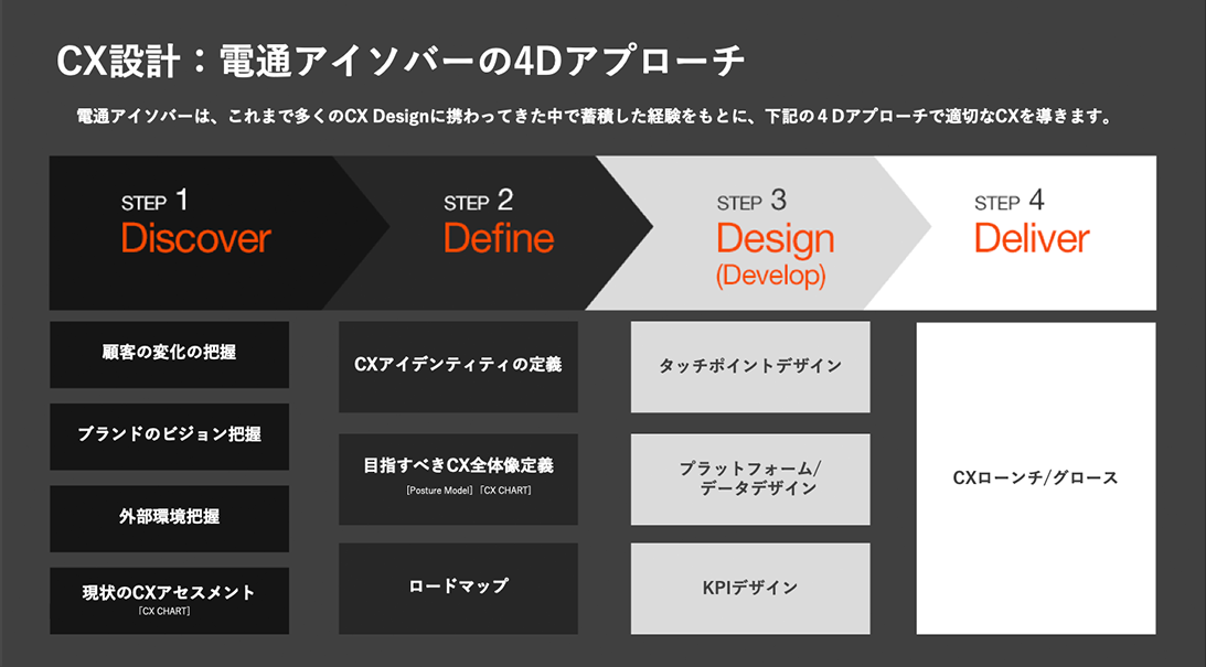 電通アイソバー(現 電通デジタル)では、顧客とブランド、そして外部環境の3つの視点で現状のCXアセスメントを行なうDiscoverのフェーズをベースに、現状からあるべき姿や成長のロードマップを策定するDefineのフェーズ、タッチポイントのデザインやKPIの設定を行なうDesignのフェーズを経て、実行フェーズであるDeliverへと移り、戦略のチューニングを都度行なう「4D」のアプローチを進めています。