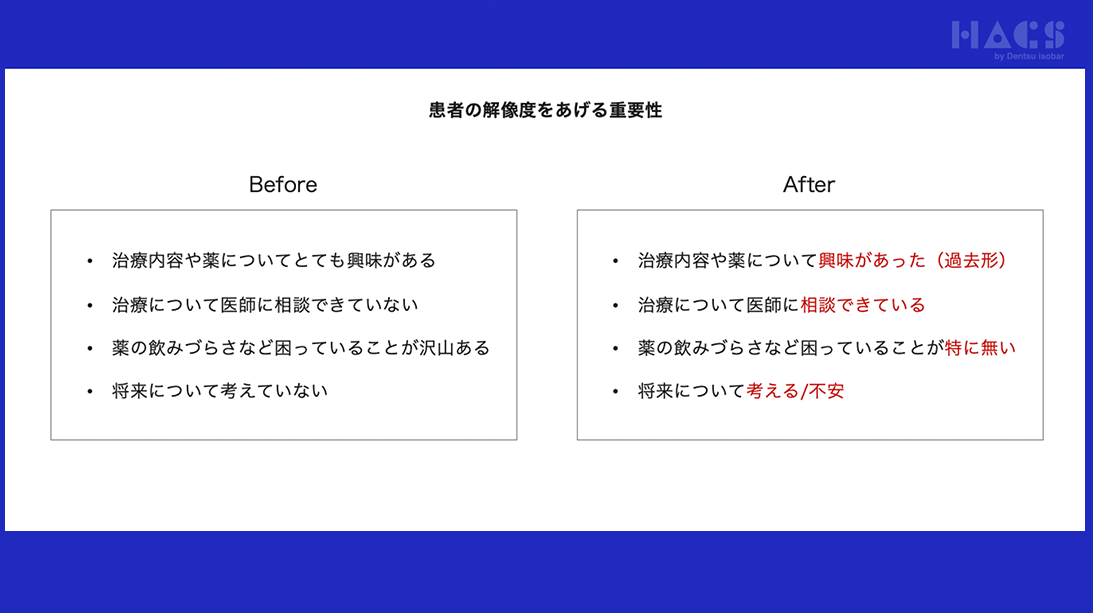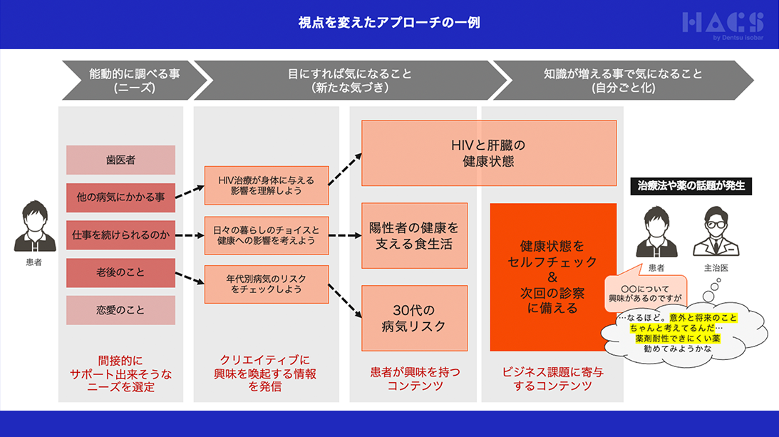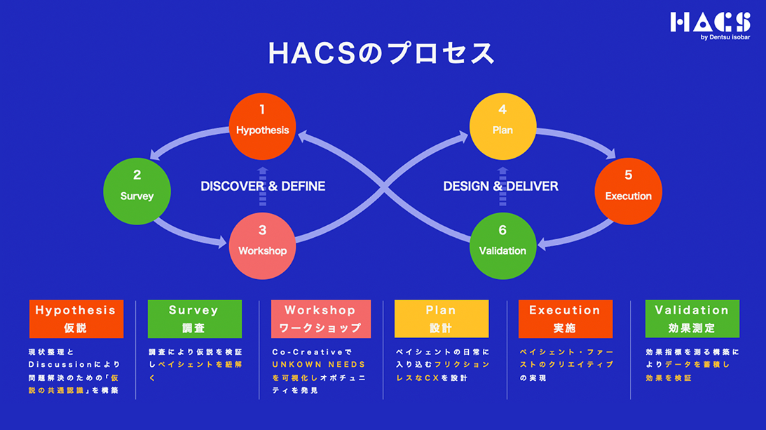 電通アイソバー(現 電通デジタル)が蓄積してきたマーケティング業界の知見や生活者視点で施策を検討・実施してきた実績を、医療・メディカル業界が培ってきた患者への目線と組み合わせ、2つの視点から患者の課題を多面的に捉えることができれば最善のコミュニケーションを生み出すことができるーーそのような考え方で生まれたHACS。