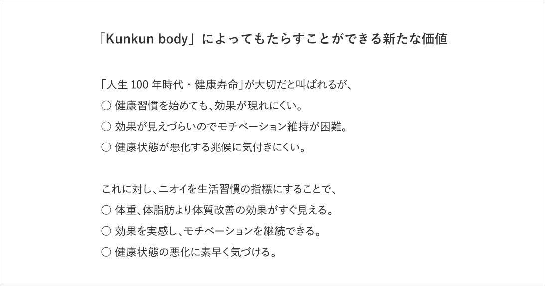 著書によると、「人間の体のニオイは、体温・体重では大きく反応しないケースも、生活習慣に影響され敏感に変化する」とのこと。その考え方と、今日の社会課題である「人生100年時代、健康寿命」とを掛け合わせ、改めて「Kunkun body」によってどのような価値をもたらすことができるのかを検討した結果、たどり着いたのが次の課題とその解決方法です。