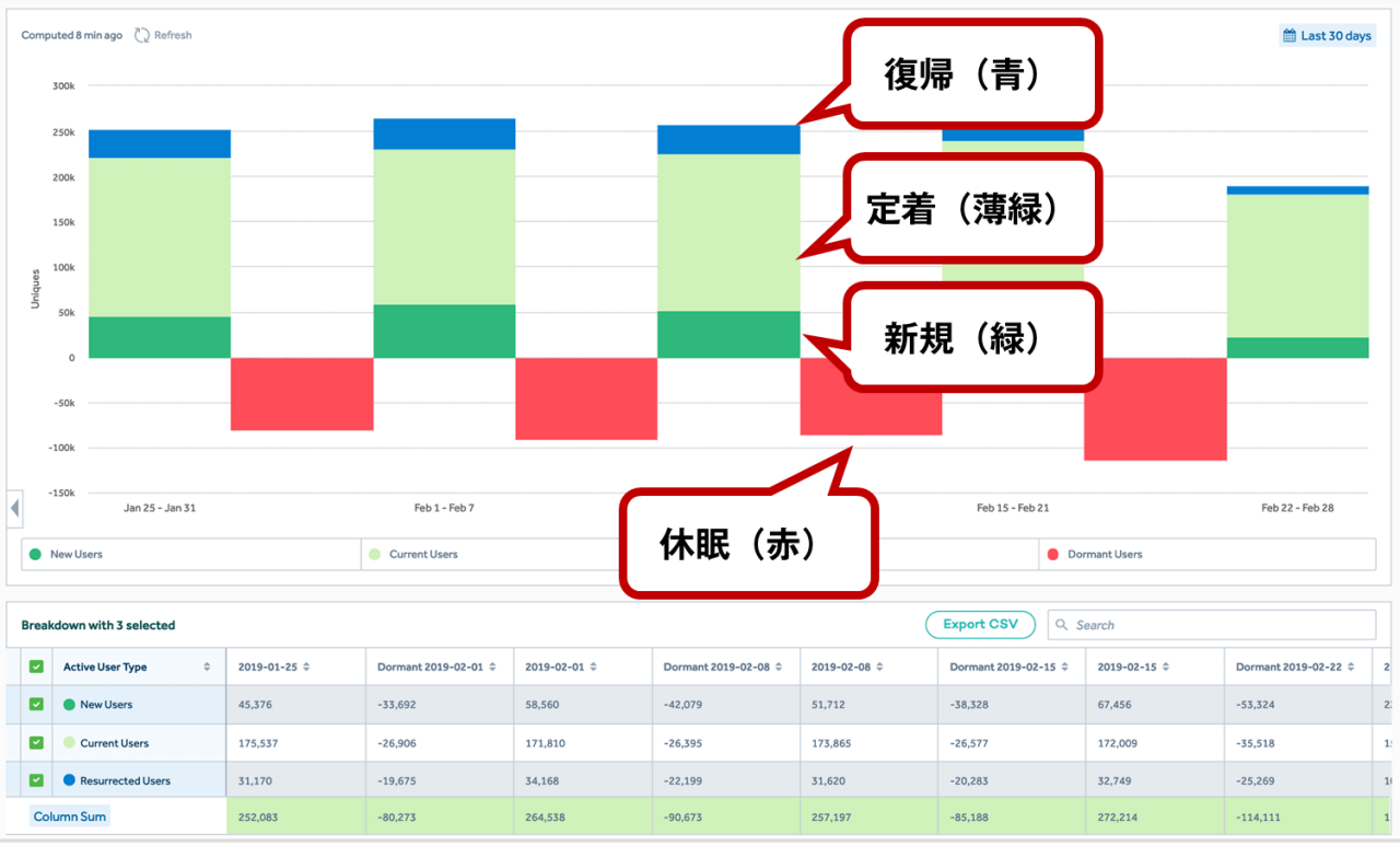 ③は、特定のセグメントを切り出せるなど、とにかく豊富なリテンション(継続利用)を計測する機能です。リテンション定義自体も細かく3種類あります。「N-Day Retention」では丁度「その日」に戻ってきたユーザーでのリテンション、「Unbounded Retention」では「その日以降」に戻ってきたユーザーでのリテンション、「Bracket Retention」では「3~6日以内」「7~10日以内」など特定の期間を区切ったリテンション分析があり、痒いところに手が届く状態になっています。それだけではなく、Amplitudeの【Lifecycle】チャートを使うと、リテンションのインターバルを設定すれば、ユーザーの状態を「新規/定着/休眠/復帰」に分類した状態で、一瞬で描画させることができます。おそらく、既存のアナリティクスツールでここまで見られるものはないはずです。