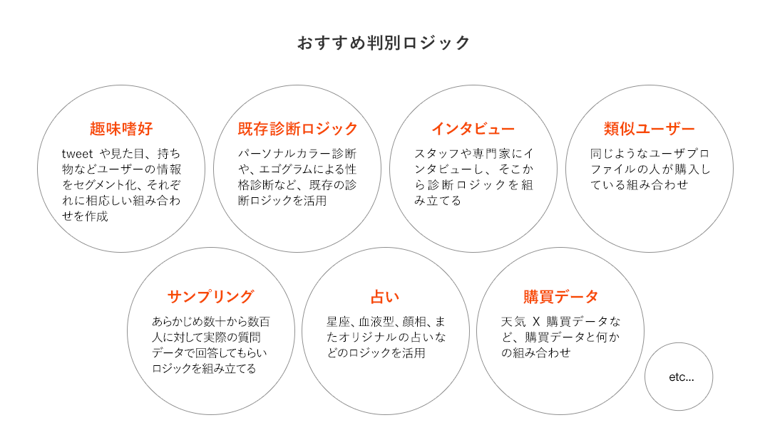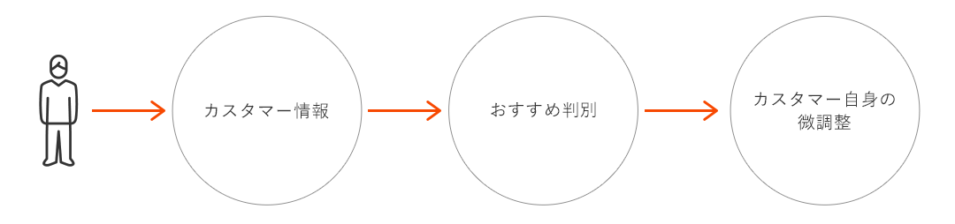 顧客情報の取得時、EC連動による購買履歴や画像認識による見た目など、自動で取得できる情報に、顧客自身の選択を加味することで、顧客に決定への関与感をもたらします。それらの情報により、機械学習をはじめとした診断ロジックによりタイプ判別、結果にもとづくレコメンドを行います。