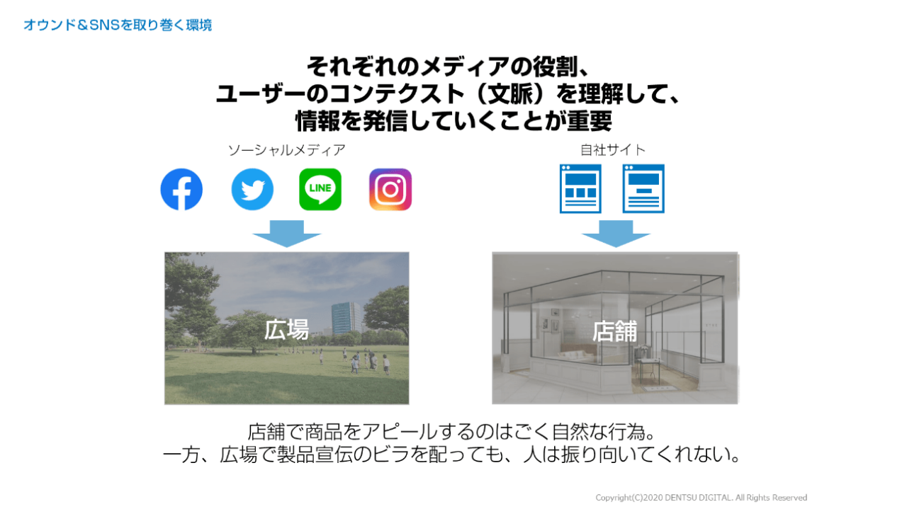 店舗(オウンドメディア)は企業主体の場ですが、広場(ソーシャルメディア)はユーザー主体の場。これが役割の違いです。