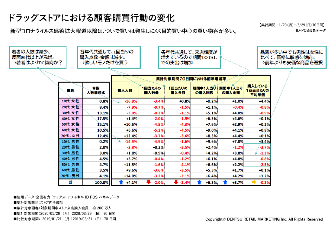 「1月20日から3月29日までのドラッグストアの購買行動について200万人に対して電通リテールマーケティングが調査したところによると、感染拡大の報道以降は“ついで買い”が発生しにくくなり、目的買いが中心の買い物客が多くなっていることが分かった。10〜20代の若者は店舗を訪れること自体が少なくなり、eコマースを利用するようになったと考えられる。一方、50代以上は来店回数が伸びている。