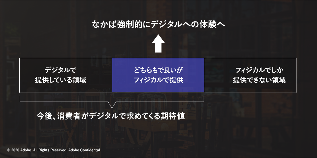 「これまで、物を販売するチャネルは、eコマースのような『デジタルで提供している領域』と、飲食店のように『フィジカルでしか提供できない領域』の間に、『どちらでも良いがフィジカルで提供していた領域』があった。しかし、この領域が半ば強制的に『デジタルで提供する領域』になるよう求められるようになっている」としました。