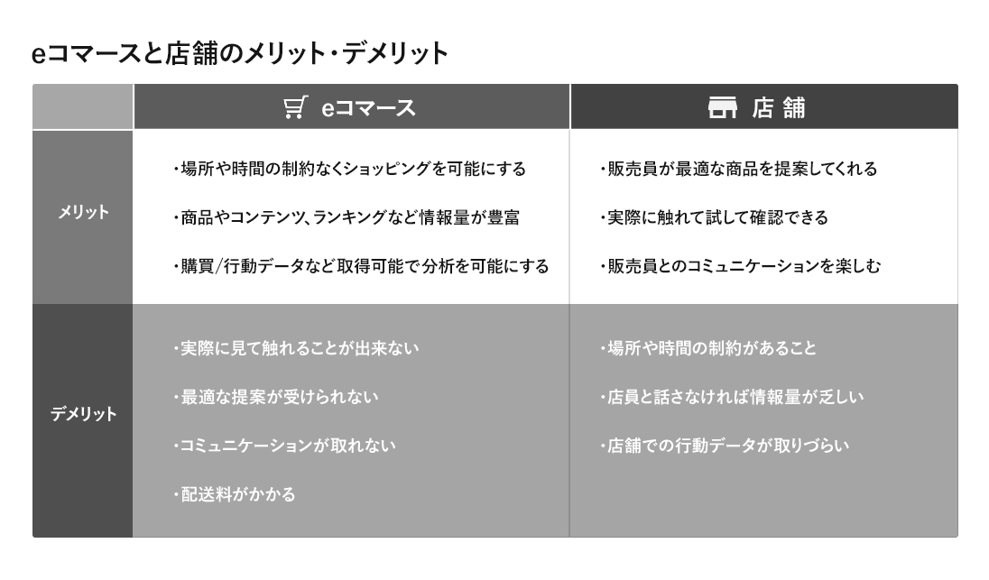 従来、店舗とeコマースの運営について考える際には、それぞれのメリット/デメリットにフォーカスが当てられてきました。