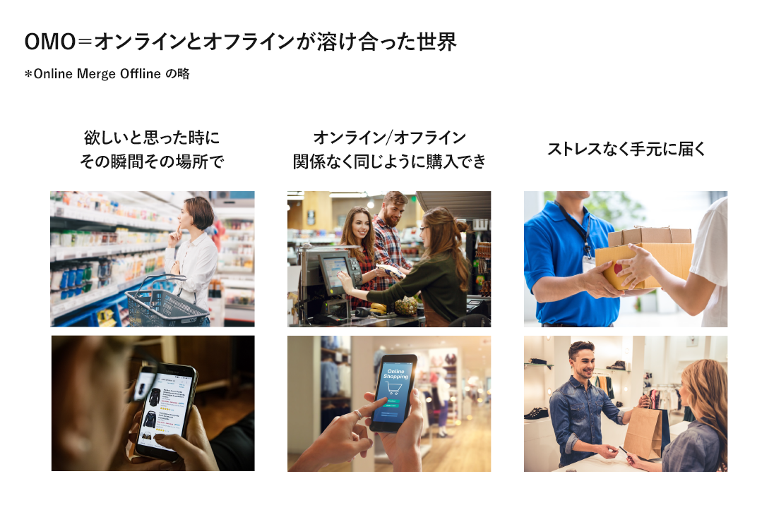 船井は、OMOは、「欲しいと思った時にその瞬間その場所で」「オンライン/オフライン関係なく購入できる」「ストレスなく手元に届く」を実現できる、と言います。