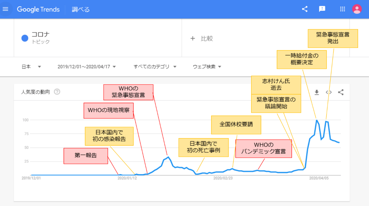中国・武漢での初報告が2019年12月31日。上記グラフは、その前(2019年12月1日)から執筆時(2020年4月17日)までの、日本での「コロナ」というトピックに関する検索全般の動向を表しています。縦軸が検索量、横軸が日付です。