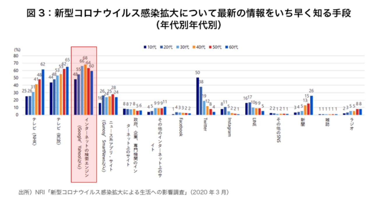 野村総合研究所の「新型コロナウイルス感染拡大下の日本人の情報収集行動」(2020年4月9日)によると、コロナに関する情報入手手段として検索エンジンを使う割合は、20代以降では過半数。10代でも48%と、ほぼ半数を占めます。