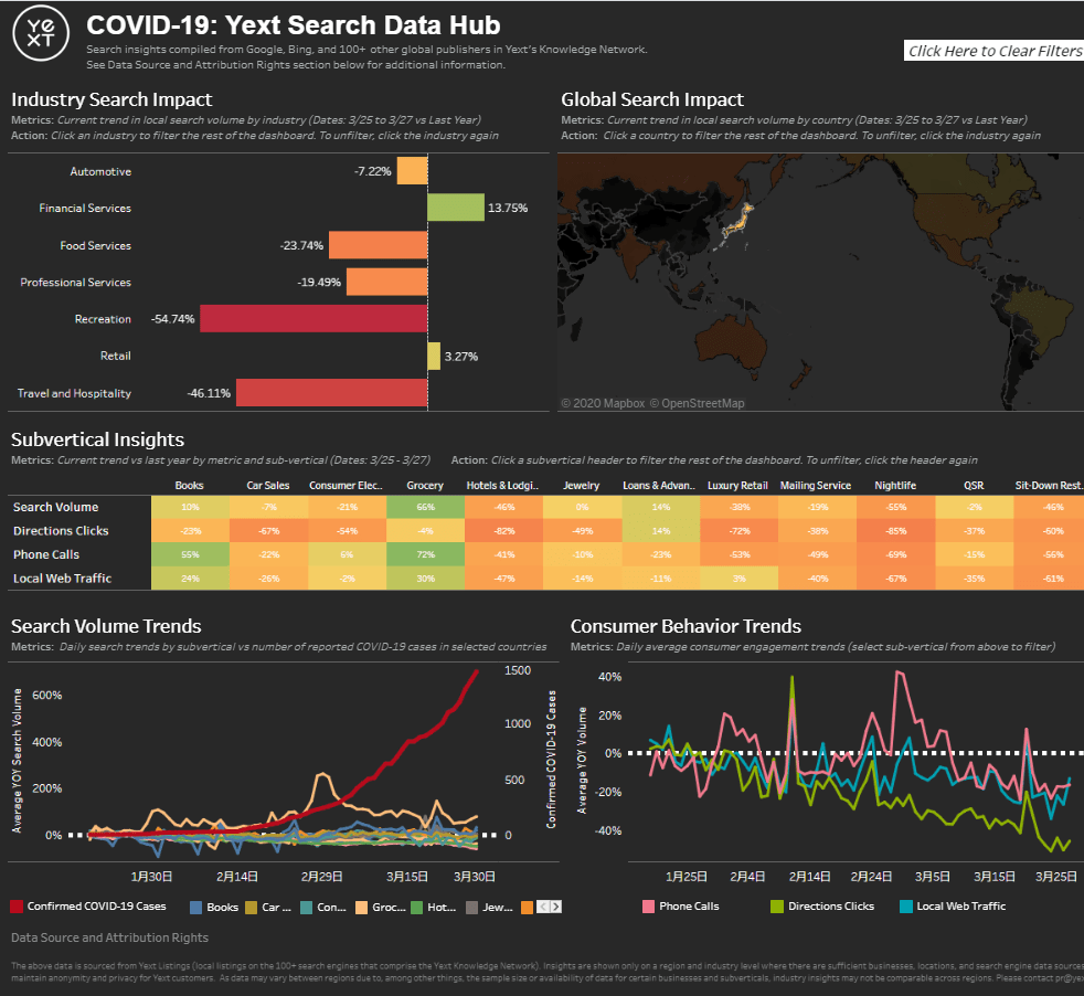 Yextの「COVID-19: Yext Search Data Hub」からは、業種ごとの検索需要だけでなく、「経路をクリック」「電話をかける」などの行動をもうかがい知ることができます。日本では書籍・家電分野で「検索需要に比べて、電話の伸び率が大きい」傾向が見られますが、これも在宅需要の増加によるものと考えられます。