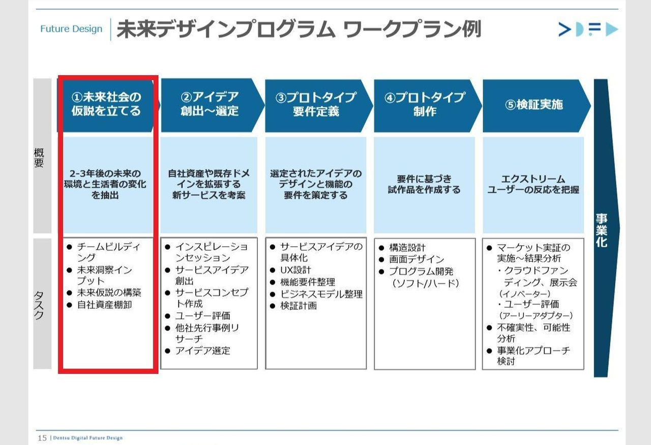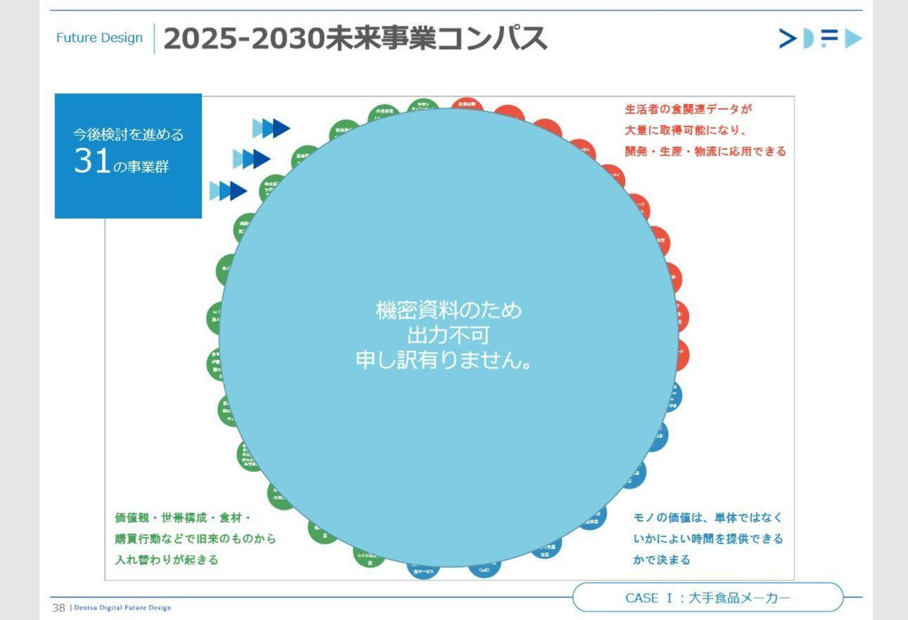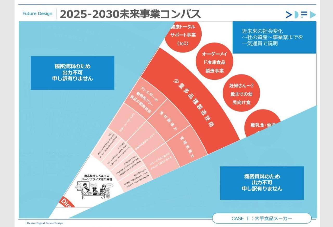 ニチレイの事例に関しても、たまたまわれわれのセミナーにいらした経営企画の部長職の方との名刺交換から始まりました。それがきっかけで、まずは主だったメンバーの方と電通デジタルの社内で「未来曼荼羅」を使ったブレストを行い、そのあとニチレイ社内でも同様の勉強会を行い、徐々に他の社員を巻き込んで社内に改革の雰囲気を醸成させながら、順序立ててプロジェクト化していきました。