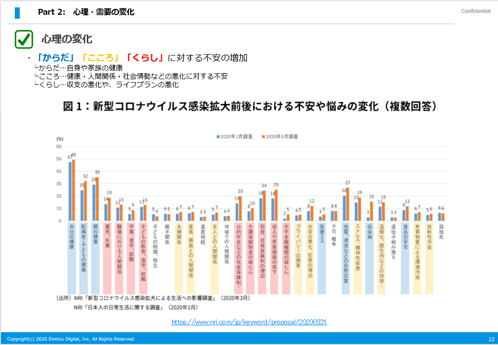 「1 行動の変化」では、新型コロナウイルス症候群(COVID-19、以下"コロナ"と呼称)による行動の変化を取り上げました。では、その背景にある個人の心理・需要には、どのような変化が起きているのでしょうか。