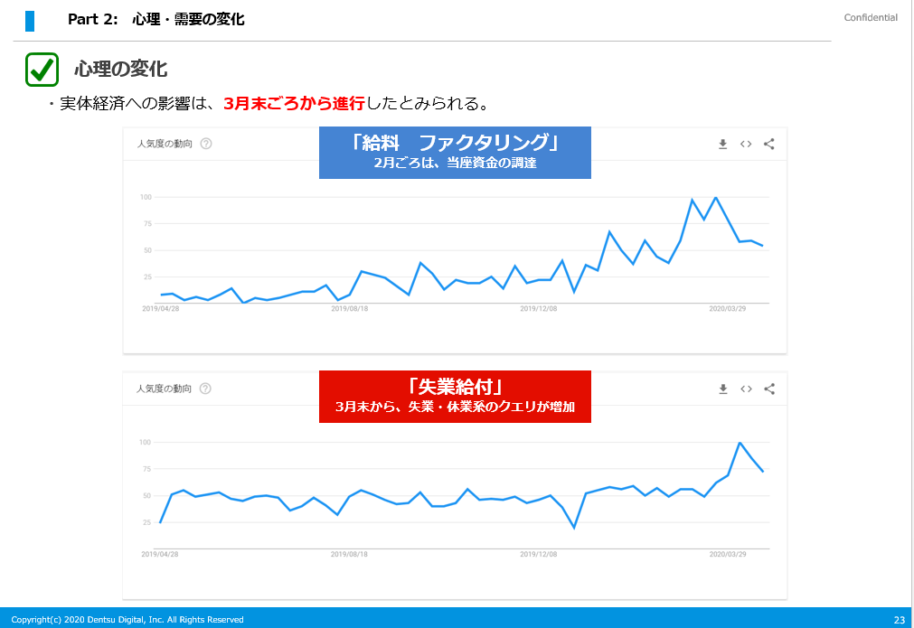 しかし、今回の「コロナ」という危機に対しては、検索需要は低下しています。これは皆さんもご想像のとおり、外出自粛要請や、感染すること・させてしまうことへの危惧が原因と見られます。