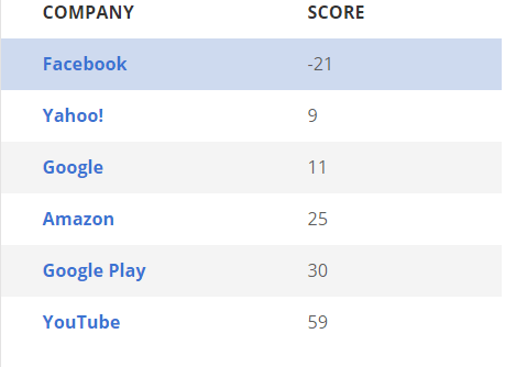たとえば、以下に挙げるFacebookやAmazonといったグローバルなインターネット企業のNPSを見てほしい。