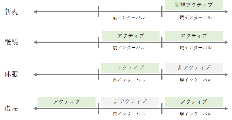 - 復帰(Resurrected):過去アクティブだったが、前月は非アクティブで、当月アクティブになったユーザー